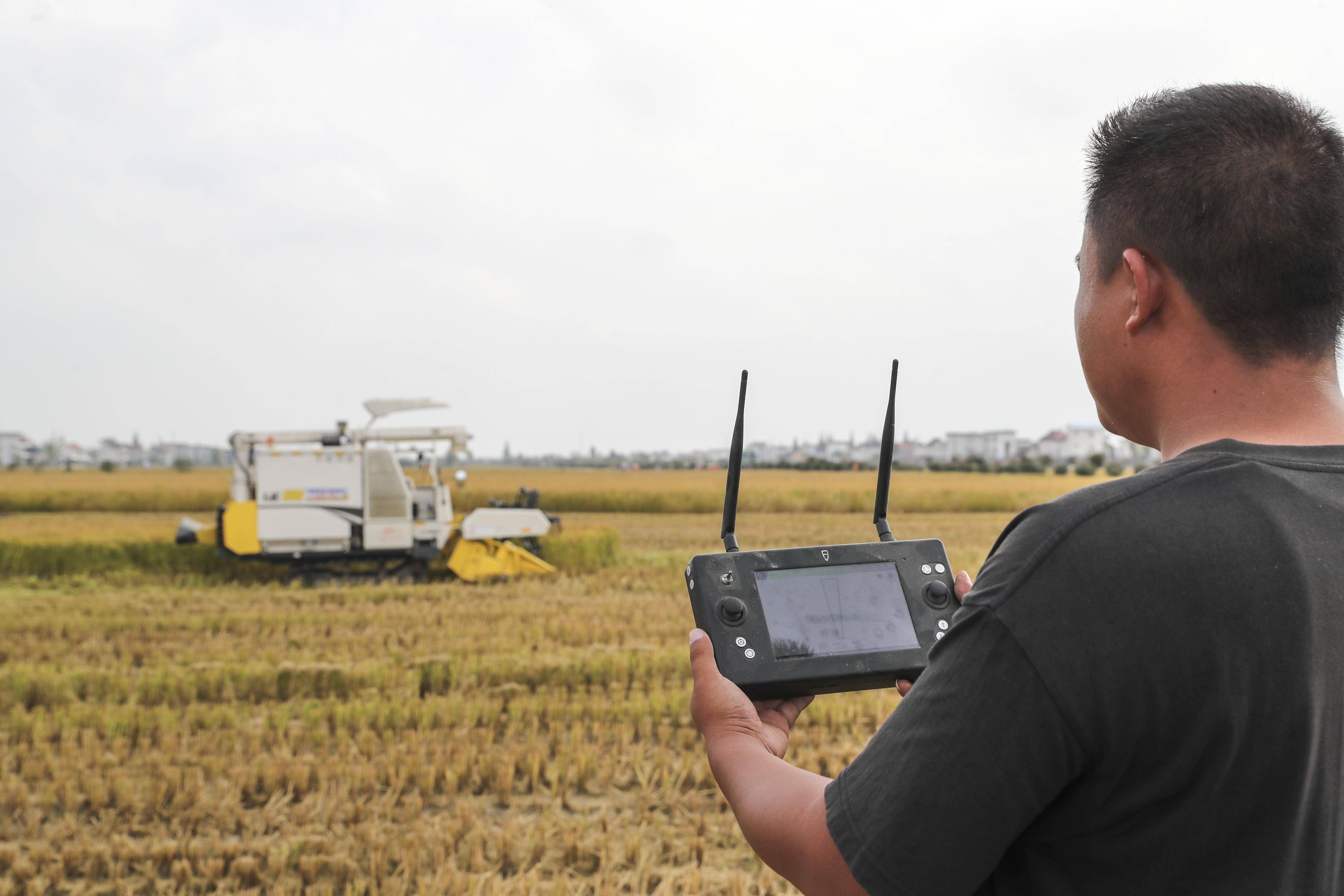 南通市十总镇育民村农场,技术员查看无人收割机工作情况