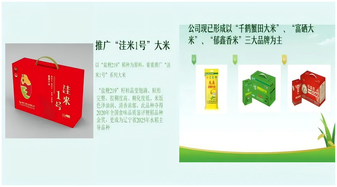 公司主营产品洼米1号,是大洼区精心培育与全力推广的优质大米品牌,洼米1号是辽宁省盐碱地利用研究所针对盐碱地培育的特殊稻种,其生长特点是抗盐碱、抗倒伏、抗病性高,做出的米饭米粒晶莹剔透、色泽油润、米香浓郁、饭粒软糯Q弹食味值高等特点。曾经获得第三届全国优质稻品种食味品质鉴评金奖。